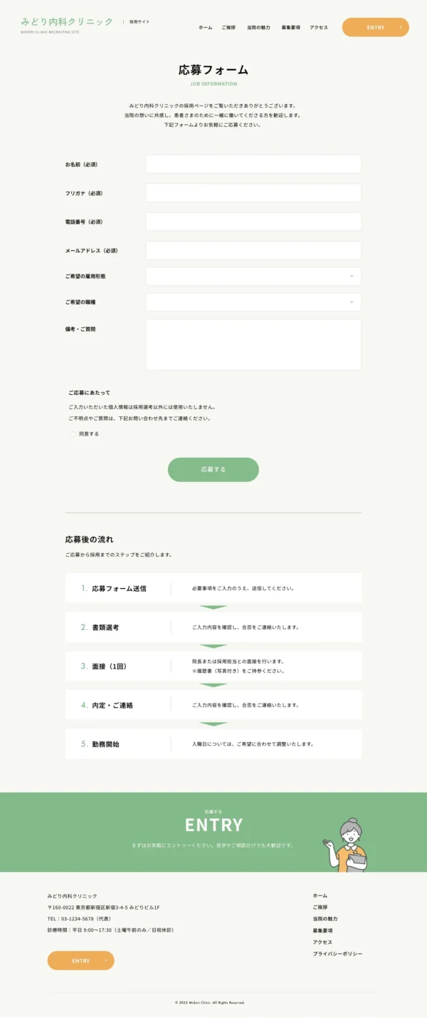 視線誘導設計:「院長挨拶 → 働き方 → 募集要項 → 応募フォーム」という流れを自然に誘導。